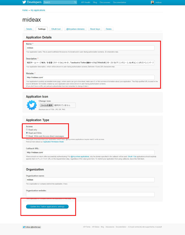 2. 設定画面で「Twitterアプリケーション登録ページ」をクリック。
